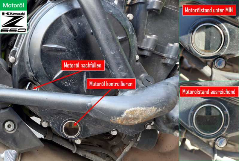 Um die meisten Flüssigkeitsstände korrekt ablesen zu können, sollte dein Fahrzeug auf einer geraden Ebene abgestellt und waagrecht (z.B. mit Hauptständer) gehalten werden, damit die Flüssigkeitsstände nicht verfälscht werden. Man sollte stets wissen, welche Flüssigkeiten in welchen Behältern zu finden sind, um gegebenenfalls etwas nachzufüllen. Im Zweifel, bevor man einen Fehler macht und die falsche Flüssigkeit nachfüllt, sollte stets die Betriebsanleitung des Fahrzeugs beachtet werden.